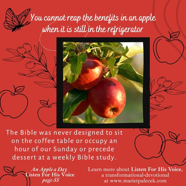 The Bible was never designed to sit on the coffee table or occupy an hour of our Sunday or precede dessert as a weekly Bible study. So, why does Sunday’s message evaporated like the morning dew before you leave the church parking lot? What happens when we read God's word daily? An Apple A Day will solidify your desire to benefit from daily inspiration.