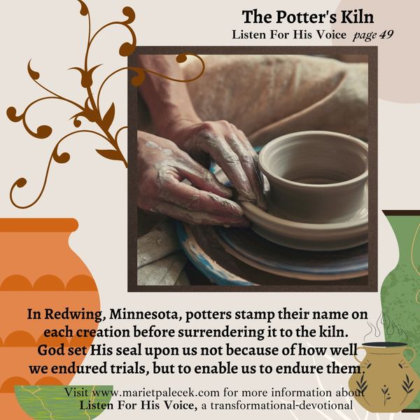 The potter safeguards their masterpiece from the moment their hands first grasp the lump of wet clay on the wheel. Even in the fiery furnace, the potter never allows the kiln to ruin what took so long to accomplish. The Potter Kiln invites you to feel the Master Potter's hands on your life whether you are on the wheel, in the kiln, resting, or actively serving.