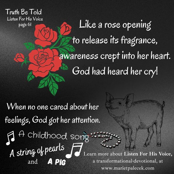 Although every relationship struggles, your pain is unique. Self-pity parties are justified when your feelings are not acknowledged. Initially, Truth Be Told, was how God used pearls and swine to minister to me during a rough patch in my marriage. Since then, my 'pearls' have enabled me to minister to others dealing with the same feelings. Truth Be Told is not longer just my story but a combination of women whom God has ministered to with a simple childhood song, a string of pearls, and a pig. All of the facts are true, just not all to the same person. May our stories minister to you, too.